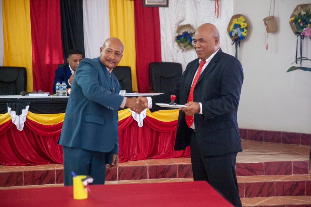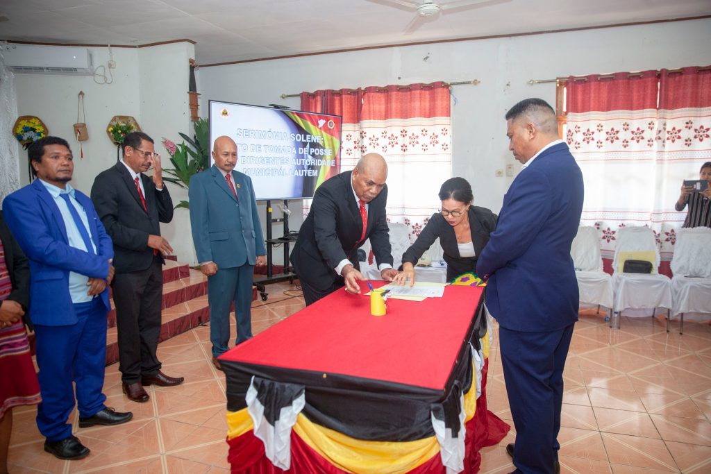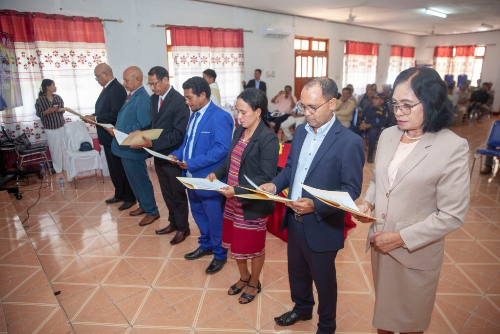 ๐๐ฎ๐ ๐๐ฌ๐๐ฅ๐๐ง๐ฌ๐ข๐ Prezidente Autoridade Munisipรกl Lautรฉm, ๐๐ซ. ๐รฉ๐ฅ๐ข๐จ ๐๐ ๐๐๐ฌ๐ฎ๐ฌ ๐๐, fรณ Auto Tomada de Posse ba emposadu sira hamutuk na’in Ualu, mak hanesan Sekretรกriu Munisipรกl Administrasaun no Finansas, Sekretรกriu Munisipรกl Asuntu Sosiais no Organizasaun Komunitรกriu, Diretor Servisu Munisipรกl Finansas, Diretor Servisu Munisipรกl Aprovizionamentu, Diretor Servisu Munisipรกl Planeamentu Integradu no Dezenvolvimentu, Diretor Ajensia Planeamentu, Diretora Servisu Munisipรกl Rejistu Notariadu no Servisu Kadastrais no Diretora Servisu Munisipรกl Asaun Sosial, ne’ebรฉ halaโo iha Salaun Administrasaun Autoridade Munisipรกl Lautรฉm.