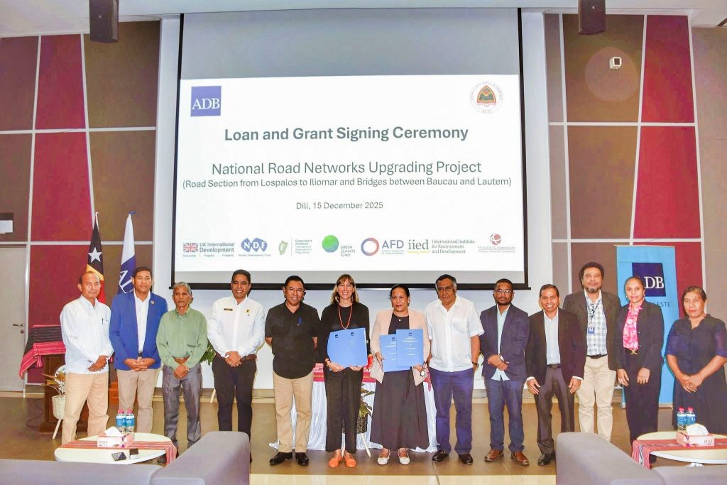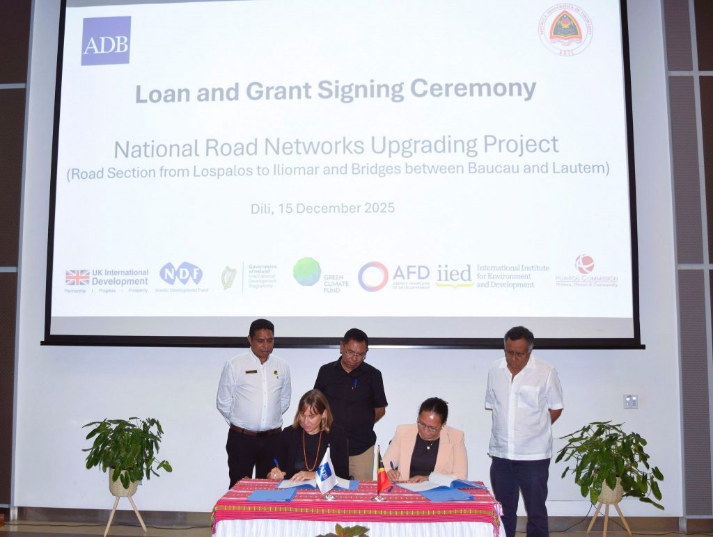 𝗦𝘂𝗮.𝗘𝘀𝗲𝗹é𝗻𝘀𝗶𝗮, Prezidente Autoridade Munisipál Lautém, 𝗦𝗿. 𝗠é𝗹𝗶𝗼 𝗱𝗲 𝗝𝗲𝘀𝘂𝘀 𝗦𝗛, akompañia ho Diretor Servisu Munisipál Obras Públika no Transporte Munisípiu Lautém, 𝗦𝗿. 𝗔𝗯𝗿ã𝗼 𝗩𝗶𝗲𝗶𝗿𝗮 no Administrador Postu Administrativu Iliomar 𝗦𝗿. 𝗙𝗲𝗿𝗻𝗮𝗻𝗱𝗼 𝗖𝗮𝗿𝗱𝗼𝘀𝗼 𝗱𝗲 𝗗𝗲𝘂𝘀 partisipa serimónia pakote finansiamentu entre Banku Dezenvolvimentu Aziátiku (ADB) no Governu Timor-Leste liu husi Ministériu Finansas (MF) ho Orsamentu Valor hamutuk miliaun $78 hodi Hadia Estrada Diresaun Lospalos-Iliomar ho (km-42), nune’e mós harii ponte Boot tolu (3) no dezeña ponti rua iha diresaun Baucau-Lautém, serimónia asina pakote finansiamentu ne’e hala’o iha Salaun Ministériu Finansas, Ai Tarak Laran Díli.