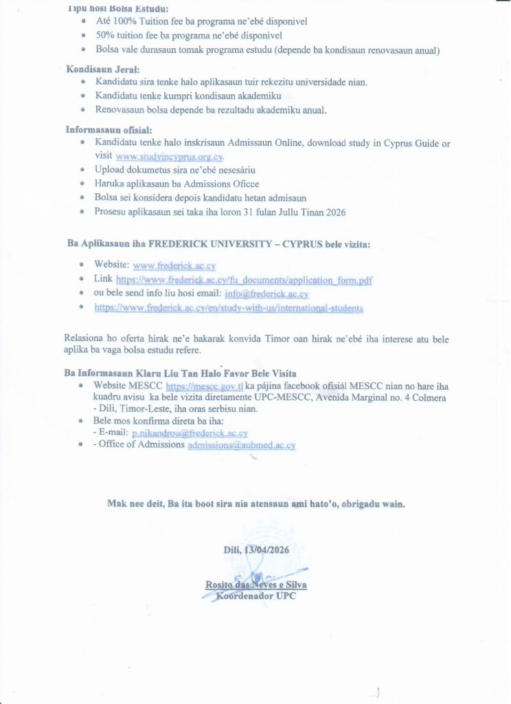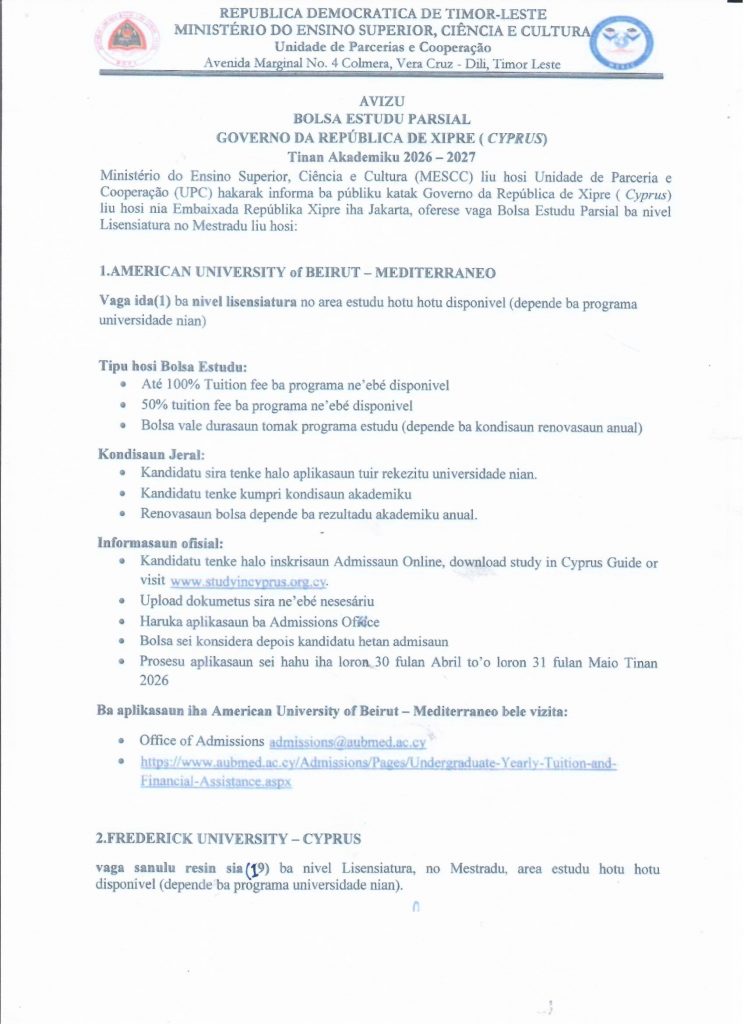 Ministerio do Ensino Superior, Cinecia e Cultura (MESCC) liu husi Unidade de Parceria  e Cooperação liu Embaixada Republika Xipre iha Jakarta oferese vaga bolsa estudu parsial ba nivel lisensiatura no mestradu. Ho ida ne’e Autoridade Munisipal Lautem, liu husi Servisu Munisipal Administrasaun no Rekursu Umanu informa ba publiku bele konkore tuir data nebe iha.
