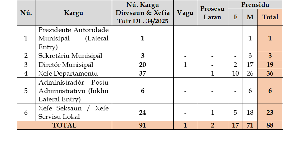 - Dekretu-Lei Nú. 34 /2025, 15 Outubru Alterasaun Dekretu-Lei Nú. 84/2023, 23 Novembru, no alterasaun da-neen ba Dekretu-Lei Nú. 3/2016, 16 Marsu, kona-ba Estatutu ba Autoridade Munisipál sira no Grupu Tékniku Interministerial ba Desentralizasaun Administrativa;