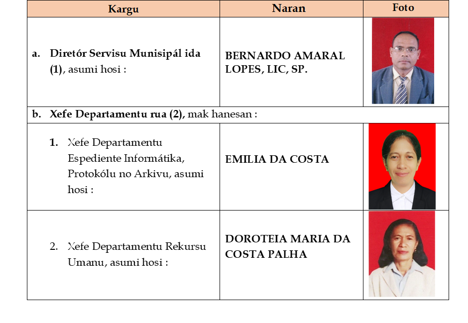 - Organiza no akompaña prosesu administrativu hotu-hotu ne’ebé la’ós responsabilidade servisu munisipál seluk nian;