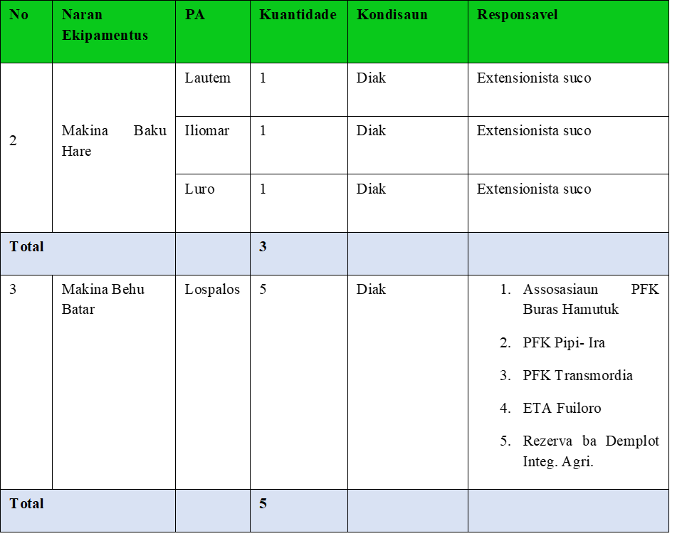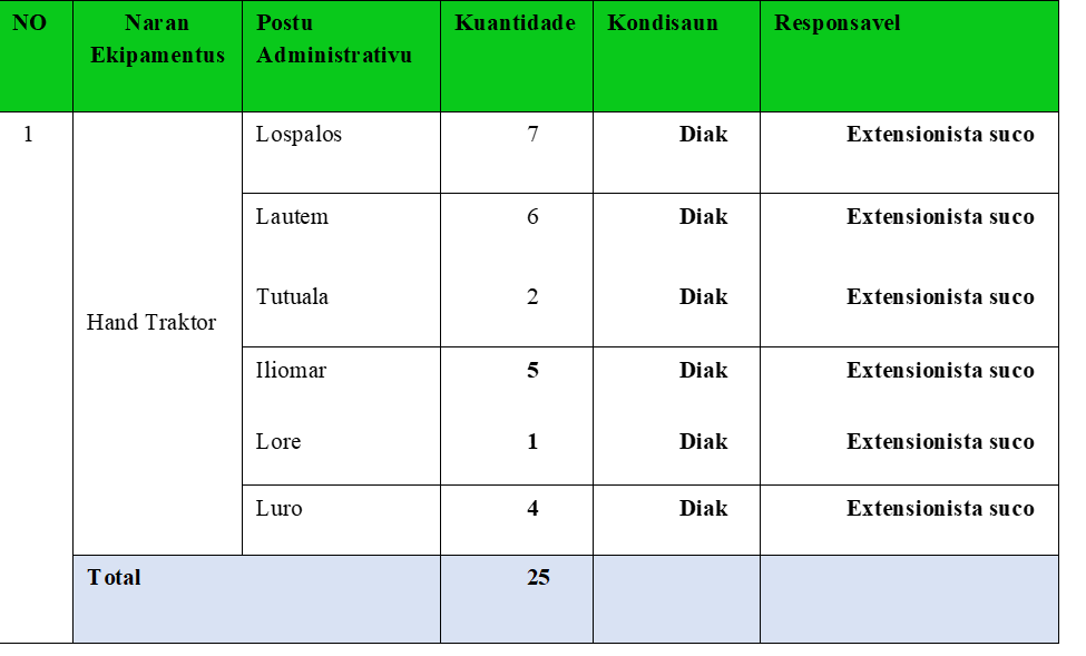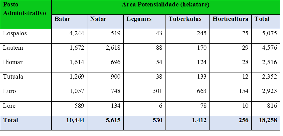 Hanesan ita hotu hatene katak objektivo dezenvolvimentu Nacional atu valoriza moris diak ba povu tomak iha vida material no spiritual. Atu atinji objetivu dezenvolvimentu Nasional ne’e, husi V to’o IX Governo Konstitusional fo prioridade ba seitor Saude, Edukasaun no Agrikultura. Seitor agrikultura iha orientasaun husi Ministro Agrikultura Pecuaria, Pescas e Floresta atu halo plano no implementa tuir area potensialidade iha Municipiu ida-ida.