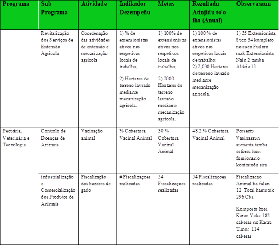 Realidade husi dezenvolvimentu nasional parte Agricultura ne’ebe oras ne’e la’o dadaun mak Ministro Agrikultura Pecuaria, Pescas e Floresta defini politika parte teknika no administrativa Ministro Agrikultura Pecuaria, Pescas e Floresta no fo orientasaun ba Servisu Municipal Agricultura no NGO Internasional sira ne’ebe involve iha seitor agricultura atu promove nafatin agrikultores iha terreno hodi hasa’e produsaun/porduktivedade, kria kampu de servisu no hasae rendimentu agrikultores.